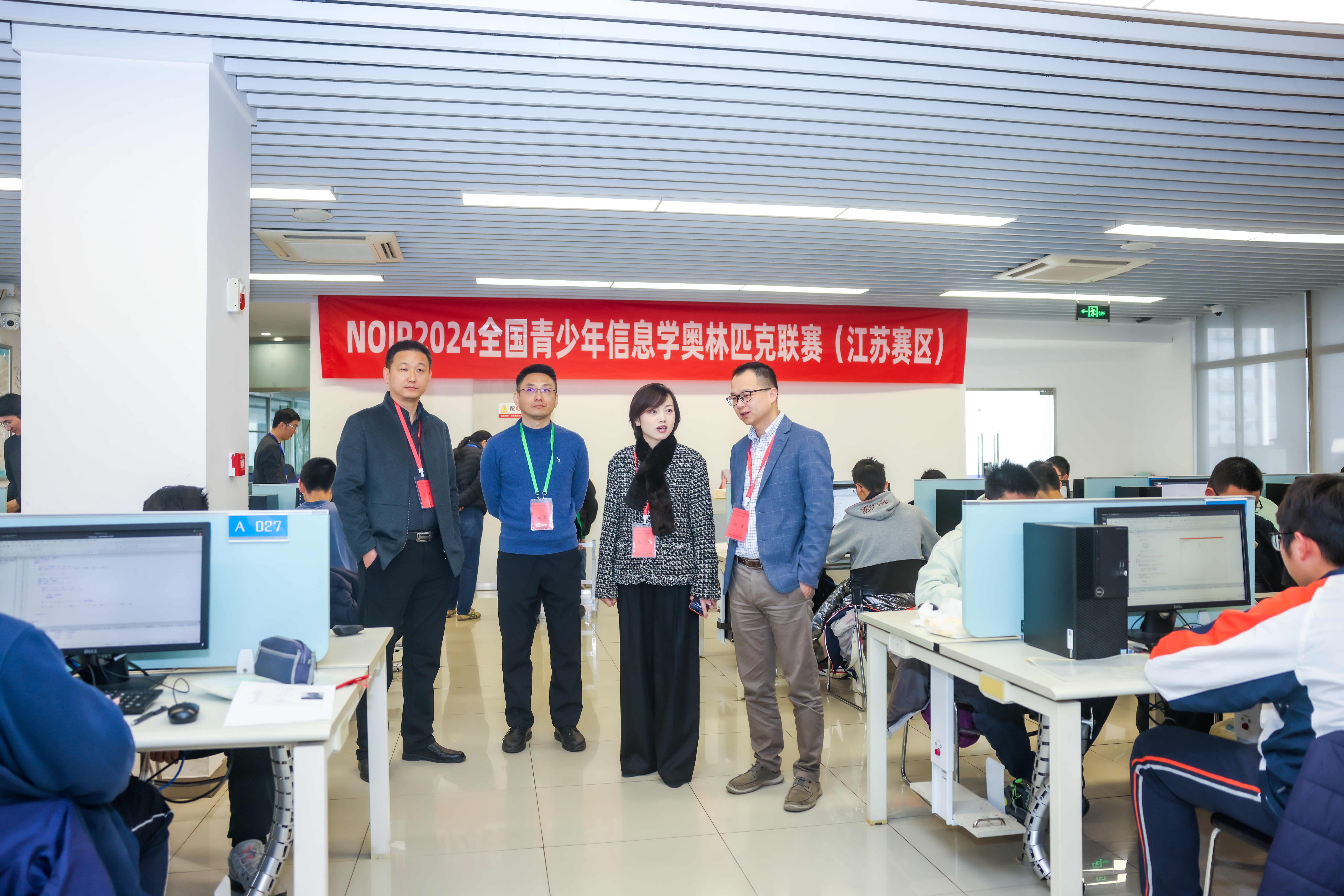 江苏省教育厅基教处四级调研员张国宇、江苏省青少年科技中心主任李莹,在计算机学院副院长李鑫及相关工作人员的陪同下,现场考察指导考务工作。