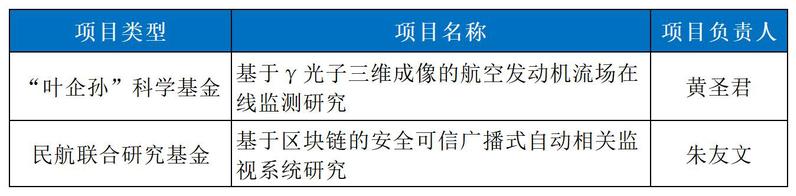 《基于γ光子三维成像的航空发动机流场在线监测研究》项目面向高端装备运行状态下流场在线监测重大需求,针对航空发动机冷热态流场在线监测的难题,开展γ光子三维成像与流场参数动态响应特性研究,拟提出航空发动机冷热态流场在线无扰动监测方法,实现非接触式、高分辨率全三维流场在线监测;《基于区块链的安全可信广播式自动相关监视系统研究》项目针对ADS-B报文因缺少认证和加密措施而存在敏感数据易泄露、报文信息易造假、成员复杂难管理、广播报文难追溯的问题,拟提出基于身份基广播加密与安全群组密钥管理的大规模流量保密方法,为安全可信ADS-B的实现提供基础理论和关键技术支撑,保障ADS-B报文数据的安全、真实、可追溯,增强飞行器和空域安全。