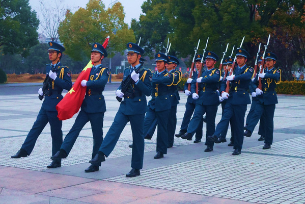 7点整,在慷慨激昂的旋律中,国旗班成员迈着坚定有力的步伐护送五星红旗入场。伴随着《义勇军进行曲》,五星红旗冉冉升起。全体人员肃立,行注目礼,奏唱国歌。