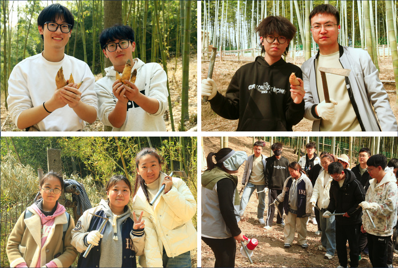 第一站,同学们走进竹林,在指导员老师的带领下认真辨别竹笋。“要注意地面的裂缝”“要注意竹笋根部很深,小心不要挖断”……指导员老师的话语听起来容易,但实际操作起来颇有难度。同学们弯着腰、拿着锄头,穿梭于竹林之间,化身“寻宝猎人”,仔细寻找破土而出的竹笋。在反复实践后,同学们终于总结出了自己的经验,找笋挖笋的速度快了起来,那一个个鲜嫩的竹笋,像是埋藏在春泥之下的珍宝,被大家小心翼翼地挖出。