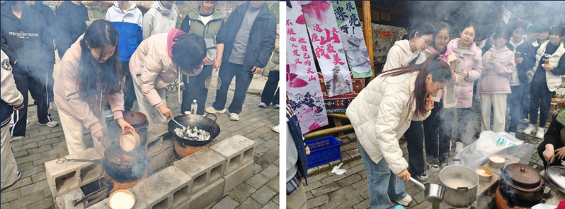 在指导员老师的帮助下,同学们化身“奶茶大师”,将糖和茶叶放入锅中焙炒,再加入一定比例的水和牛奶,熊熊燃烧的柴火,煮着香浓的茶,茶香四溢。煮好的奶茶配上新鲜的竹筒,同学们品尝到了来自山野间的清香。