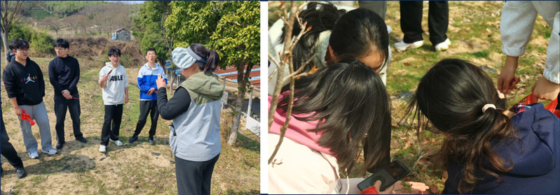 第二站,同学们走进田野,在指导员老师的帮助下学习辨识野菜。“马兰叶片呈倒披针形”“荠菜顶端开着小白花”……放眼望去田野绿油油一片,俯下身来细细观察,植物却千姿百态。同学们在反复比对中摸索经验、锻炼眼力,更加感叹到祖先们在荒野中寻找食物的智慧。