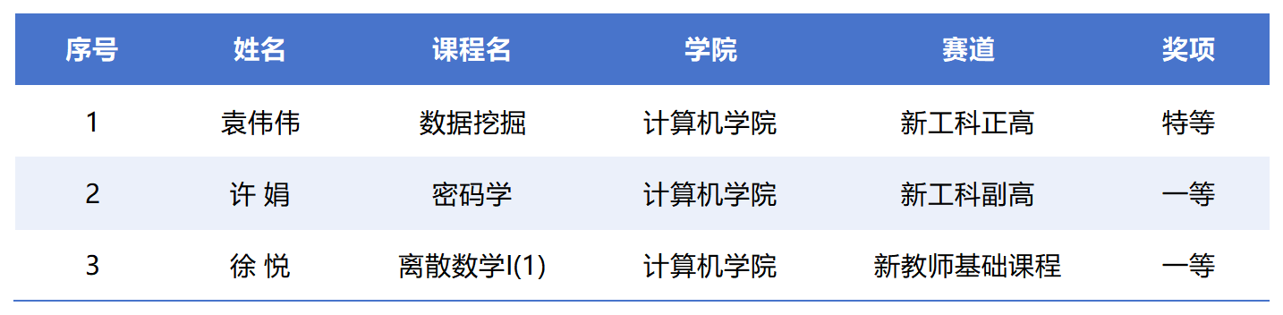 近日,江苏省高等教育学会公布了第五届江苏省高校教师教学创新大赛获奖名单。全校共获得13项省级奖项,其中计算机学院斩获3项。袁伟伟老师获得新工科正高组特等奖,许娟老师获得新工科副高组一等奖,徐悦老师获得新教师基础课程组一等奖。