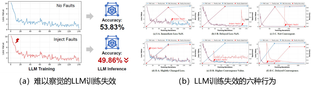 大语言模型(LLM)在高性能计算机上训练时,系统硬件偶尔会出现难以察觉的故障(如机器码0→1或1→0的翻转),这可能导致训练最终失败或者模型性能变差,从而浪费昂贵的计算资源。为了探索这一问题的机理,该项研究通过 >30万次的故障模拟实验(消耗超5千A800 GPU卡时),揭示了LLM训练的六种关键失效行为,如图1所示。论文中还提出面向LLM训练的专用轻量级容错框架LLMFT,可以在LLM训练过程中实时诊断潜在故障并自动进行修复。该框架在GPT2/Llama/Qwen等主流LLM训练负载中验证,以极低的内存开销(不到0.05%)实现接近满分的防护(故障检测平均F1-score为97.61%,检出的故障可以100%恢复)。